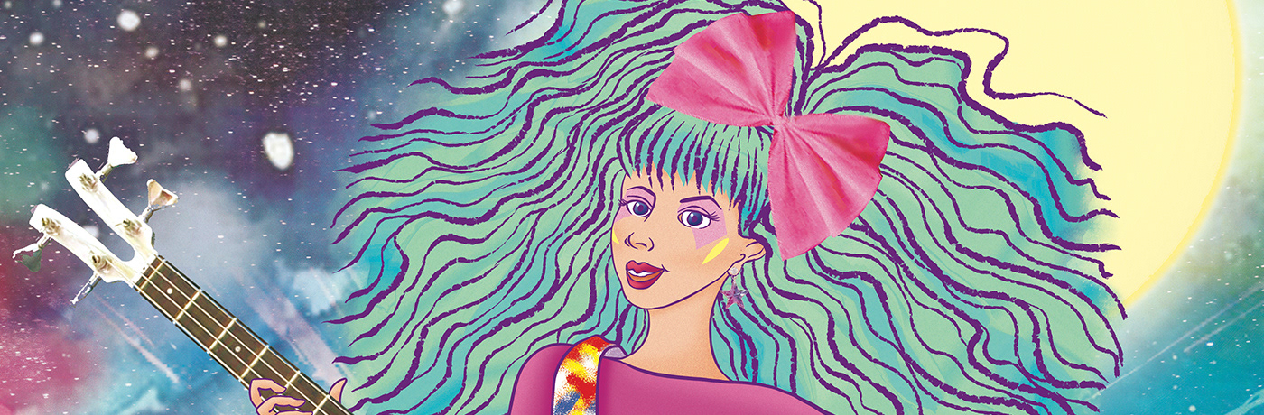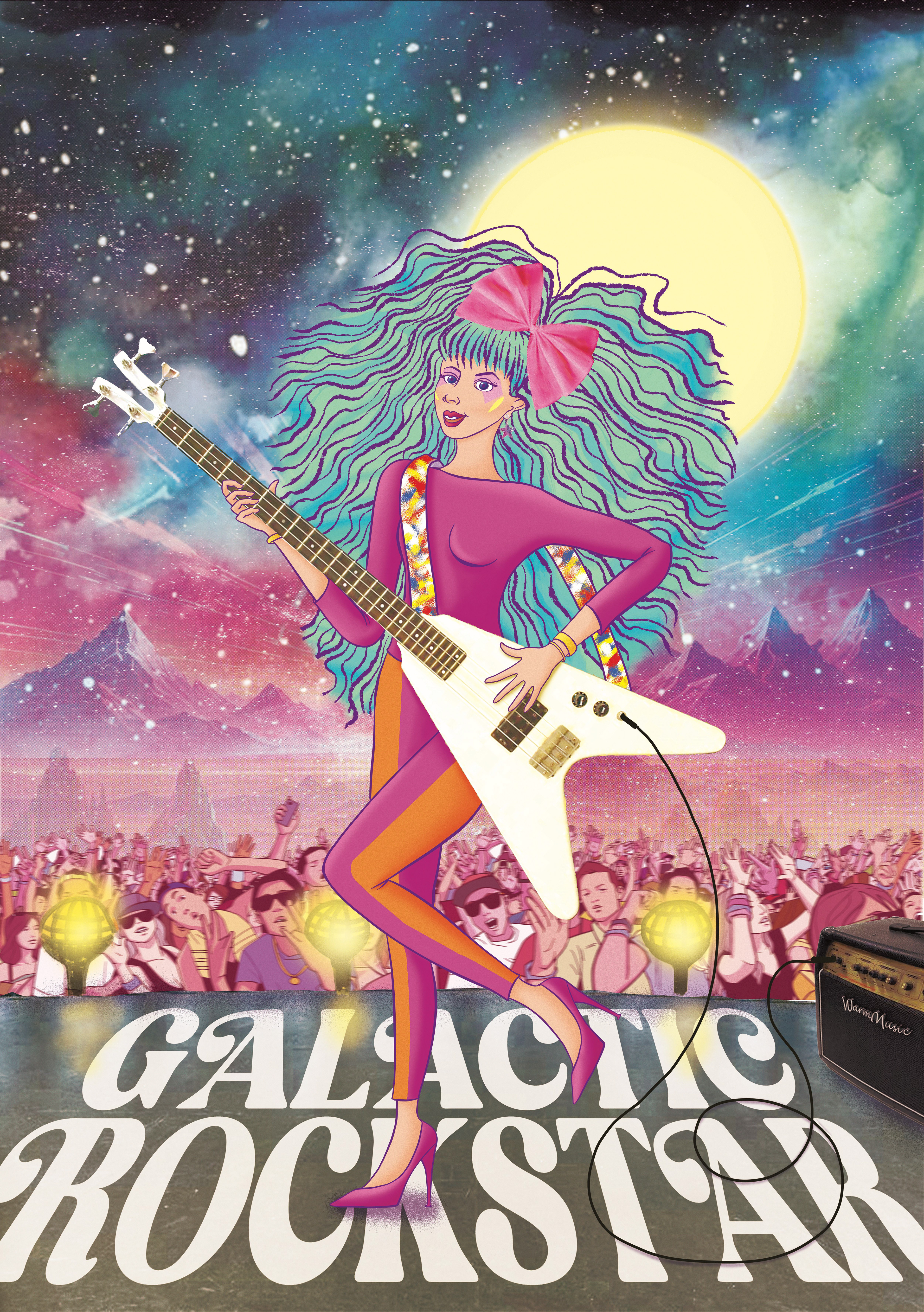 "Galactic Rockstar" captures the electric vibe of an interstellar concert under a cosmic sky. A fierce rocker with flowing aqua hair and neon pink accents wields a bold white bass guitar against a dreamy crowd and celestial moon. Perfect for glam rock or synth-pop music posters, adding a cosmic touch.
